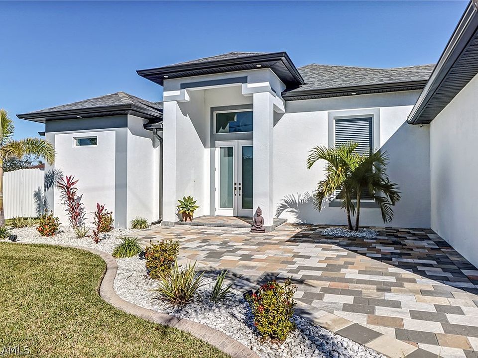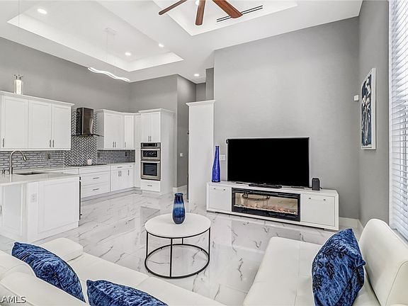 Why wait to build? ALL ASSESSMENTS IN AND PAID IN FULL! This contemporary home built in 2021 is surrounded by gulf access homes has great curb appeal with double glass entry door with transom window above and paver walkway and driveway. Luxury abounds from the minute you walk into this 4 bedroom, 2 1/2 bath home featuring tile flooring throughout, tray ceilings, and a kitchen with stainless steel appliances which includes an electric cooktop with a hood, a wall oven a microwave and exquisite lighting fixtures. The owner's suite is spacious and leads to the owner's bath with dual sinks, a walk-around shower with glass doors on each side, built in shelf, and dual showerheads. The guest bath has a glass shower enclosure, and the home comes complete with an ensuite bedroom with a half bath that also serves as a pool bath. Home is being sold furnished with some exclusions. For your outdoor pleasure and poolside entertaining, there is an outdoor kitchen with sink, and wine cooler and an ample under cover lanai. The laundry room is large with a front load washer and dryer, sink, and plenty of cabinets. There is a storage shed on the property and yard is fenced so your furry family members can enjoy the outdoor space too!