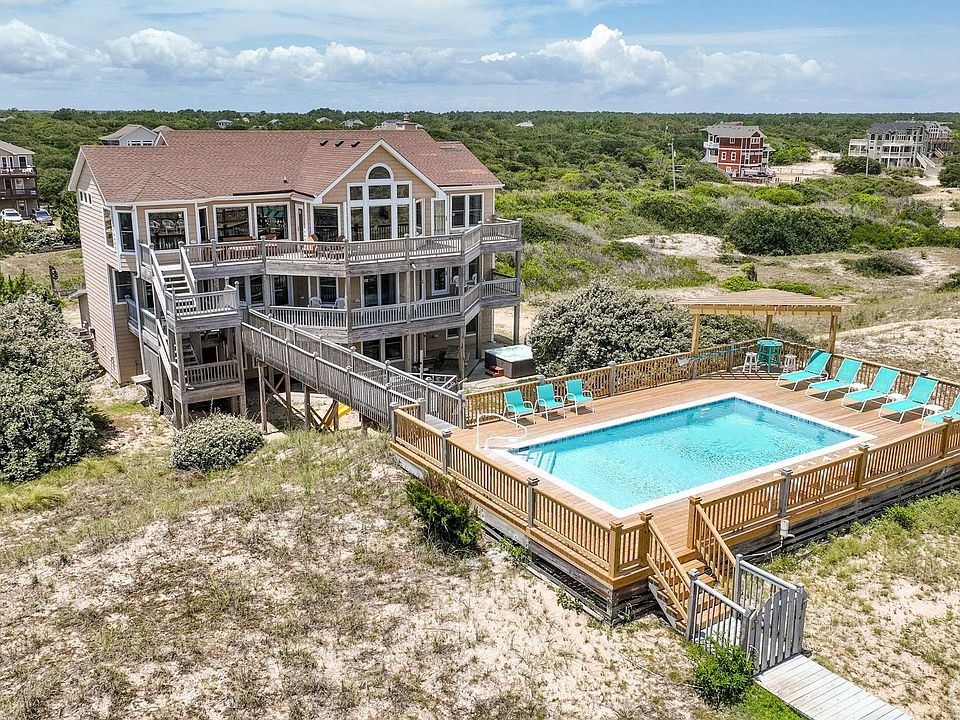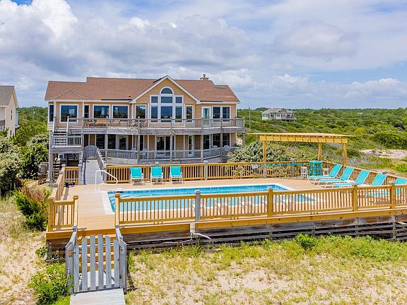 Accessible by 4x4 only, this custom built 8BR/8.5BA thoughtfully designed oceanfront retreat boasts spectacular ocean views and every conceivable amenity for the discerning buyer. On the top floor, the first of six master bedrooms w/fireplace, whirlpool tub, & deck access, an open concept living room w/entertainment center & gas fireplace, a half bath, dining room seating 20, a large tiled kitchen w/raised counter seating for 4, two dishwashers & a breakfast nook, a west side ships watch for sunset views, and eastside sun decks facing the sea. On the middle level, an entry foyer, four more master bedrooms (one handicap friendly), a bedroom, den/office, full hall bath, covered decks, a spacious elevated gated deck w/private pool, and a private walkway to the beach. On the ground level, another master bedroom, a bedroom, full hall bath, gameroom w/pool table, foosball & wet bar, ELEVATOR, laundry room, covered decks, hot tub, and pirate ship playground. Currently this home is utilized as a vacation rental with considerable in-season owner use as well. Full season rental projection on file for 2023 of $145,000 owner gross. This home is a must see!