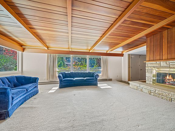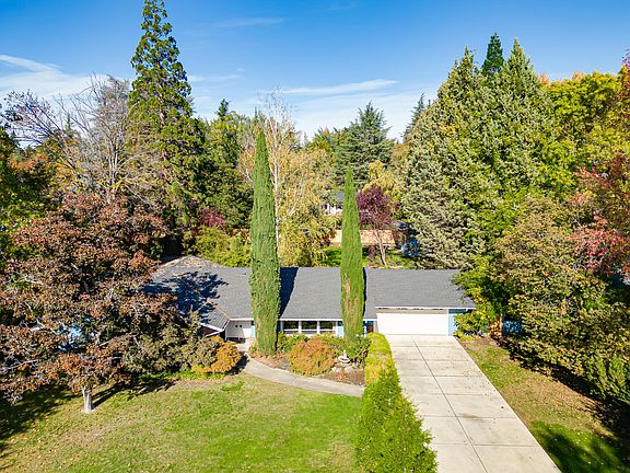 Midcentury modern gem in the heart of Old East Medford! Positioned on a hard-to-find ½ acre lot this single level 3 bed, 2 bath home seamlessly blends comfort & convenience with sophisticated design. New luxury vinyl plank, distinctive built-ins, clean lines, large windows & open spaces are highlighted throughout the home. Gracious, double door entry leads to the cozy living room featuring an oversized picture window, wood burning fireplace with stone surround & a beautiful wood lined vaulted ceiling. Convenient kitchen adjacent to living & dining areas, ideal for entertaining! Open dining/living area with a wraparound woodstove & brick frame, plus an office/bonus room flanked by glass French doors. Spacious primary suite with an ensuite, dressing area, dedicated laundry & private patio access. Huge, private backyard with lush, mature landscaping, new fencing, serene water feature & storage shed. Detached 2-car garage & extended driveway that allows for RV or additional parking.