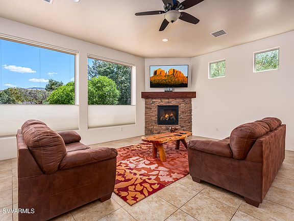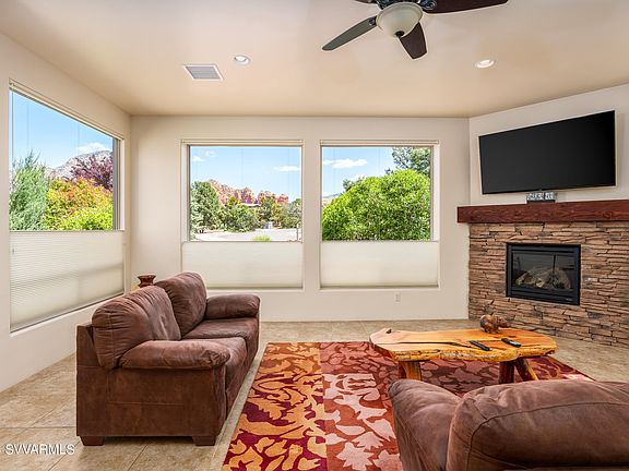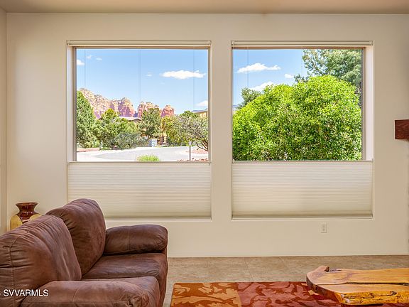 Modern single-level home in the middle of West Sedona with north-facing red rock views just blocks away from the amenities of town and the National Forest trail system. This efficient two bedroom Sante Fe-style stucco home offers a split floorplan and an open kitchen with stainless appliances. Open floorplan kitchen and main living room features oversized windows featuring the nearby red rock views. There is loads of curb appeal and southwest styling starting at the custom paver driveway and low-maintenance landscaping out front. This neat, clean and modern home is in move-in condition and even has a fenced backyard perfect for privacy and/or pets.