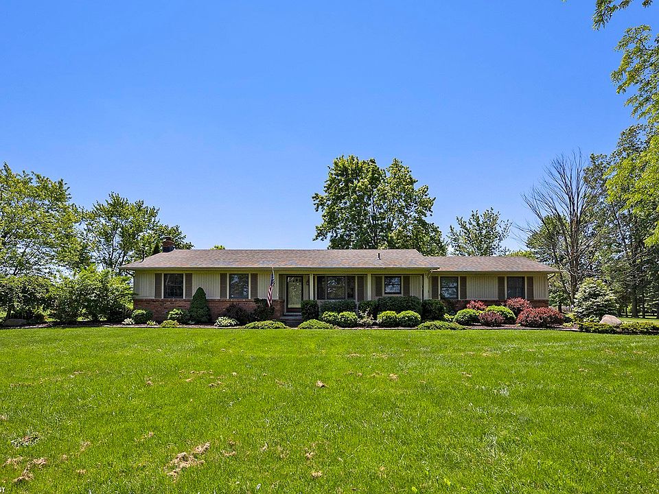 This charming brick ranch is nestled on a sprawling 10.30-acre lot with a stocked pond, perfect for fishing enthusiasts. The property features a substantial 48x48 pole barn equipped with 220v electricity, a cement floor, running water, and an insulated workshop, making it ideal for any hobbyist or small business owner. Updates include new flooring and fresh paint throughout, new fixtures, a remodeled full bath, new sump pump, and fresh mulch. The basement has hot and cold water hookups, providing an easy opportunity to add a bathroom or bar, and exterior access. Fantastic open layout with a spacious kitchen, first floor laundry, large dining area with bay window, and generous living room with doorwall that opens to the beautiful backyard. Enjoy the peace and tranquility of rural living while being just a short drive from city amenities. Don't miss your chance to own this exceptional home!