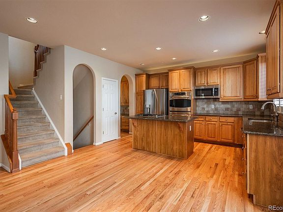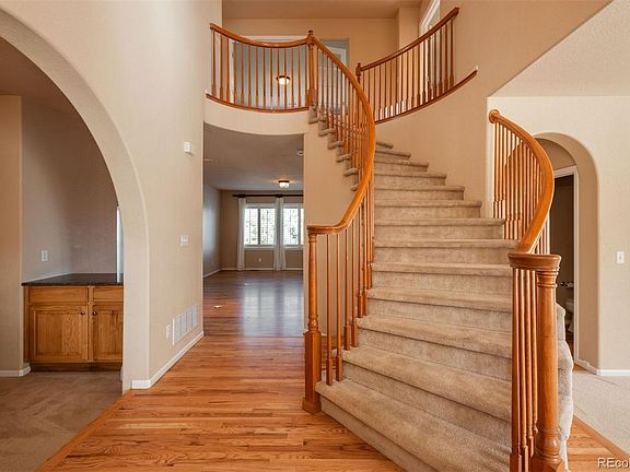 Expansive 2-story in The Villages of Parker w/ a unique lot configuration that positions the home without a neighbor in front or behind, providing ultimate privacy! As you step inside, you will be greeted by recently refinished hardwood floors, soaring ceilings & an abundance of natural light. The main living space is comprised of the family room & kitchen that seamlessly function as one space that is ideal for entertaining. The kitchen boasts granite countertops, stainless steel appliances & a center island w/ a 4-burner gas cooktop. Easily extend your gatherings out to the large Trex deck w/ built-in gas grill & captivating northwest-facing views. The family room is perfect for intimate gatherings or lively evenings w/ a stunning brick fireplace at its center. Utilize the main floor bedroom for guests or office space. A formal dining room, living room, ½ bath & laundry room complete the main level. There are 2 separate staircases that lead to the upper level where you will find the primary suite + 3 beds, 2 baths & spacious loft area. The primary suite is a relaxing retreat w/ vaulted ceiling & twinkling city/mountain lights in the distance. The luxurious 5-piece bath features a large soaking tub, dual vanity w/ granite countertops & 2 separate walk-in closets. Currently utilized as an office & set behind lovely French doors, the space could be the perfect loft, playroom, reading nook or media room! The walkout basement is the ultimate entertainment zone w/ an additional bedroom, ¾ bath & rec room. Take note of the wide planked white-oak flooring & spacious exercise room tucked behind a rustic barndoor. The lower patio is an extension of the interior living space w/ a hot tub & “dry-below” decking that keeps everything dry. The large flat backyard is a serene oasis that you will want to take advantage of as the summer season quickly approaches. Unmatched in location, you will enjoy being within walking distance of the golf course & community pool.
