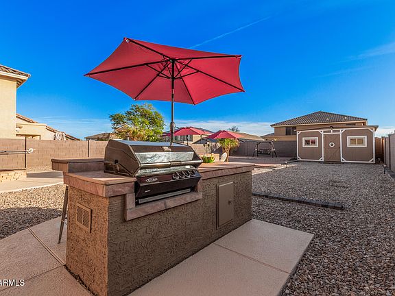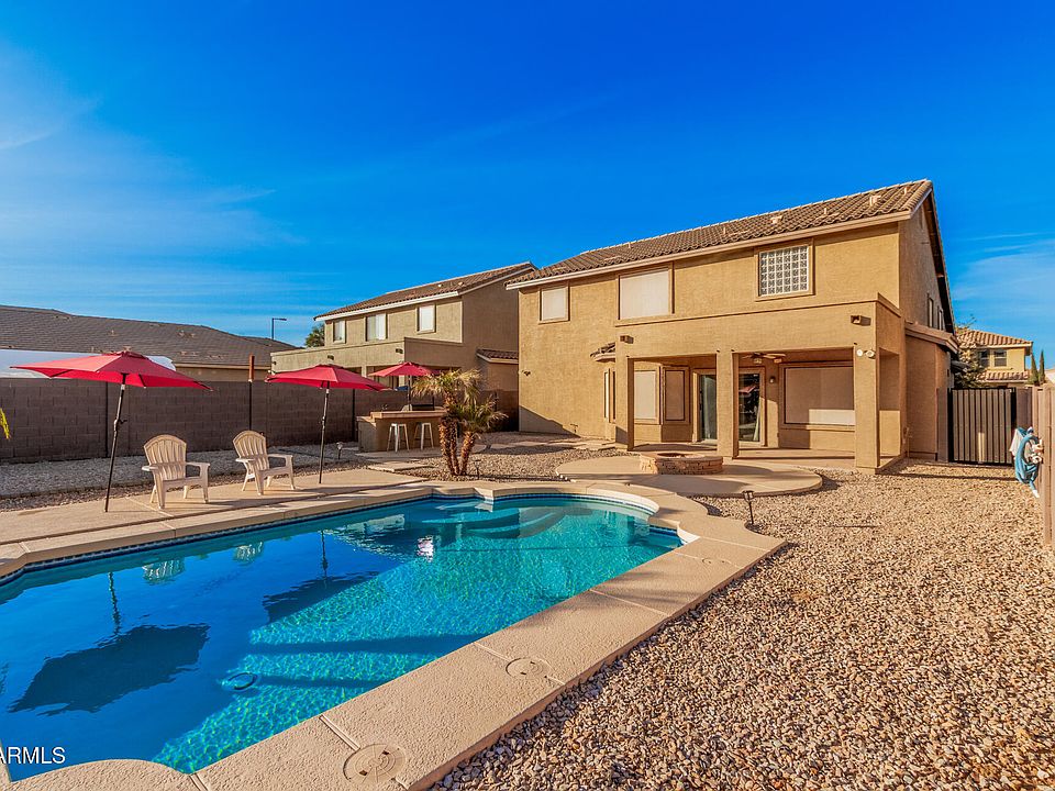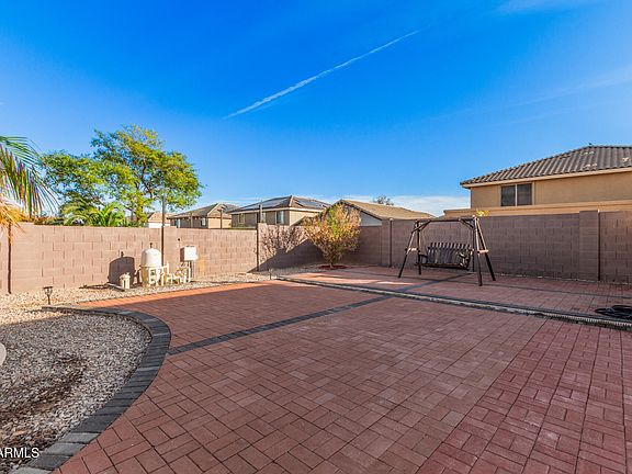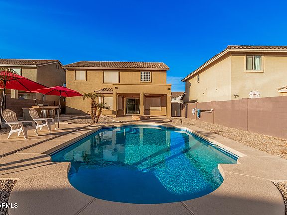 Welcome to this stunning home on a large lot. This lovely home offers a spacious floor plan with five bedrooms and 3 baths, it has been freshly painted on the interior and exterior. As you walk in you have a grand entry with vaulted ceilings and custom rod iron work. The flooring has tile throughout in all the right places and carpet in bedrooms. This beauty offers a formal living and formal dining area, along with a family room that includes an eat-in kitchen. The kitchen has beautiful maple cabinetry, granite countertops, tile backsplash and stainless-steel appliances. The backyard is the showstopper with a grand pool, featuring a built-in barbecue, fire pit for cozy evenings with family and friends. Extended pavers enhance the outdoor space, making it perfect for all your entertaining needs. The front yard also provides ample parking with its extended pavers. This property reflects true pride of ownership, and you won't be disappointed. Just minutes from 1-10 and Verrado Pkwy near all the new shops and dining.