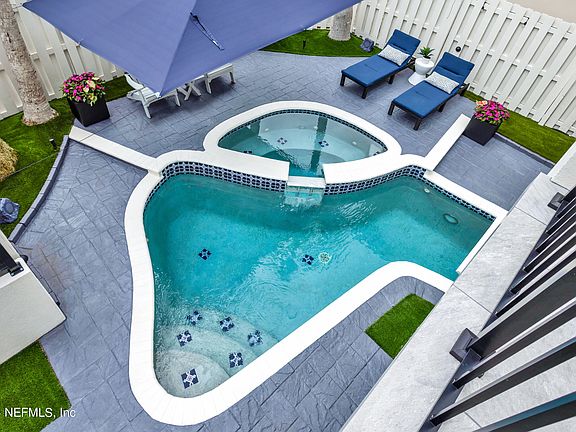 This stunning concrete home is nestled within a gated community in Atlantic Beach and has undergone a complete renovation. The house offers deeded beach access and ocean views. As you enter, you are greeted with a striking full lead glass door, setting the tone for the beauty that lies within. The home features new flooring, remodeled fireplaces, and a completely transformed kitchen with Thermador professional appliances, quartz counters, and an induction cooktop. The four bathrooms have been exquisitely renovated. The fourth bedroom is on the main floor and is currently used as a home office. The home has new, refined LED lighting throughout. Outside, the private backyard boasts a newly remodeled pool area, spa, and pool heater, among many new features creating a perfect relaxing oasis. The garage has a new tankless gas water heater, a whole home water filtration system, durable Shark flooring, and a custom workshop. This home is ideal as a primary residence or a second lock-&-leave property. The home offers extensive upgrades that ensure a modern and luxurious living experience. This home is a rare gem! Just a short bike ride to the Town Center with the 2 included Electric Bikes. The furniture can be purchased separately. Please review the Upgrade Feature sheet under the documents.
