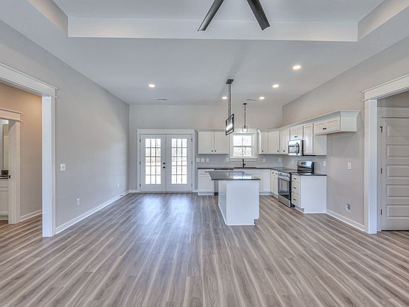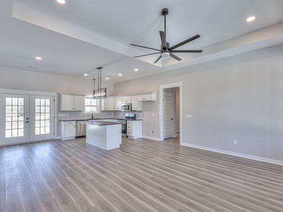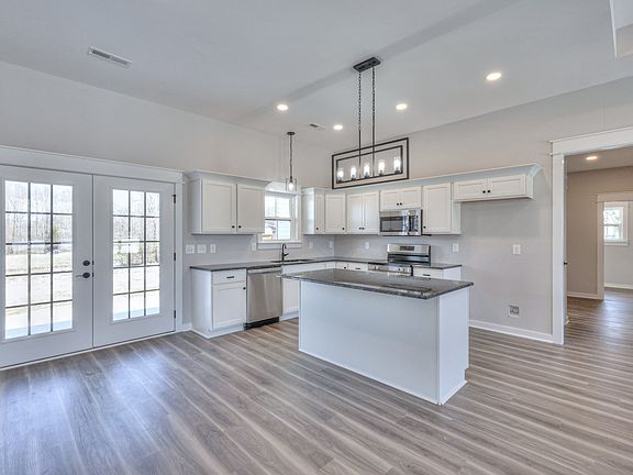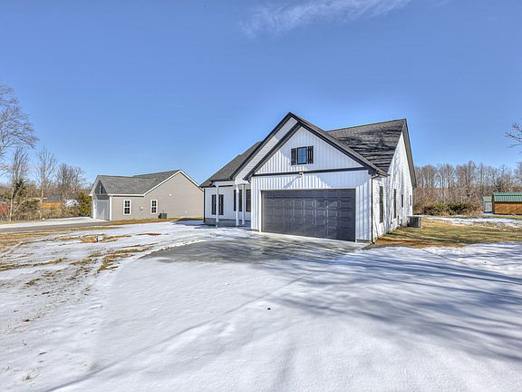 Modern farmhouse situated on 1.15 +/- acres. Welcome to country living! Home features covered rocking chair front porch, black windows to add modern look, open floor plan, trey ceiling in great room, kitchen w/island for extra seating, window above sink to enjoy your backyard, plenty of cabinets, large eating area w/door leading to covered back porch. Zoned bedrooms w/full bath conveniently located between bedrooms 2 & 3. Primary bedroom w/trey ceiling, large closet and private bathroom. Extended garage. Home is complete. Quick close available.