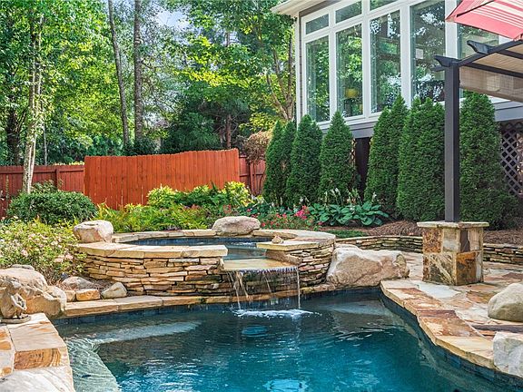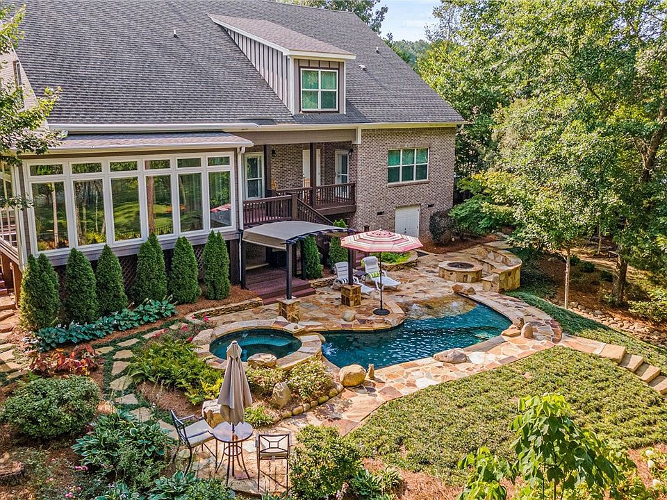 This lake view home has everything for a large family w/spacious rooms & many custom features. Lovely lake views combined w/ a custom stone soaking pool w/attached 8 man hot tub make the backyard an ideal place for relaxation & entertaining. Stone walks & plantings complete this private outdoor paradise & a custom pet play yard w/outdoor carpeting & drainage system for hosing down is rare. Inside awaits all the space needed w/large primary suite w/lake view complete w/huge closet & custom bath w/large 2 head shower. There is also a second bedroom/study on main w/private bath. Any family will love the huge custom kitchen/family room w/fireplace & direct access to oversized sunroom overlooking picturesque pool & lake. Upstairs are 4 spacious bedrooms, bonus room w/kitchenette, 3 baths, study-lounge area, walk-in attic w/spray foam insulation providing tons of attic storage. floored basement shop space, stone edged circular drive, & pet wash/grooming room are bonuses.