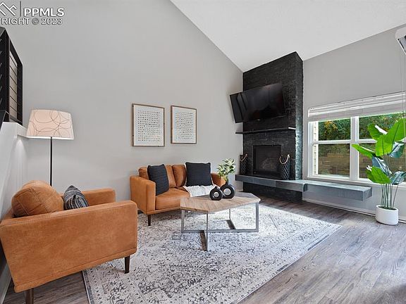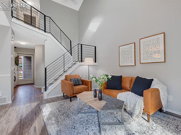 Welcome to this beautifully remodeled home, centrally located near UCCS and numerous amenities. Backing up to open space, tranquility and convenience meet seamlessly. Modern light fixtures illuminate each room, complemented by an abundance of natural light flooding through the numerous windows. The living room boasts vaulted ceilings and a fireplace, creating an inviting atmosphere for gatherings. Ease into the outdoors with two sets of sliding doors that lead to a spacious private patio, perfect for relaxation or entertaining. The open metal baluster staircase, enhanced with custom lighting, is a standout feature, setting a contemporary tone. The home boasts two primary bedrooms, each with its own ensuite bathroom, ensuring privacy and comfort. Fresh updates are evident throughout: new skylights, electrical outlets, siding, backside windows, a front door, and a crisp exterior paint job. For your convenience, the air conditioning system ensures you remain cool during warmer days, and the HOA diligently maintains both the front and back yards, ensuring a pristine environment. Plus, exterior Wi-Fi cables were updated in 2022 for enhanced connectivity. Experience modern living at its finest in this meticulously updated property.
