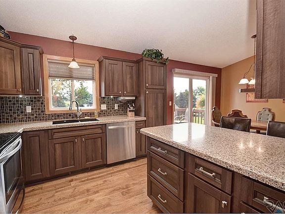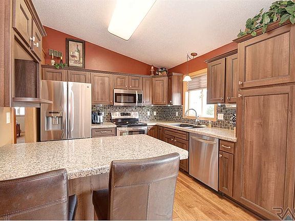 Pride of ownership is on full display in this terrific 4 bed, 2 bath home nestled in an established neighborhood with no backyard neighbors in popular SW Sioux Falls. Welcoming entry carries you into the open concept main level leading to the sundrenched living area, highlighted by vaulted ceilings and bay window. Show stopping eat in kitchen is completely updated with Granite Transformations counters, refaced cabinets, tile backsplash, engineered hardwood flooring, stainless steel appliances, pantry, island w/ breakfast bar for additional seating plus convenient slider access to the oversized deck. Two beds, both offering new carpet and walk in closets, plus full bath complete the main level. Lower tier of the home plays host to the family room featuring tile surround gas fireplace and garden windows, two spacious beds and full bath. Tasteful, warm color pallets fill the home. Double stall garage. Exterior of the home is surrounded by outstanding landscaping and mature trees.