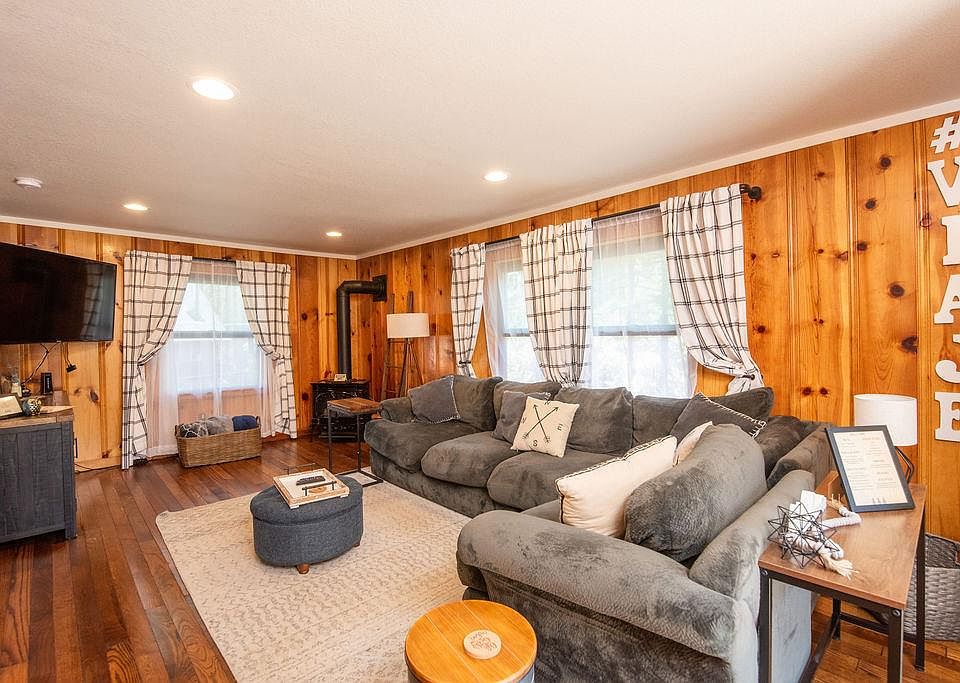 Large merged lotNew windowsRestored hardwood floorsBrand-new propane fireplaceSpacious deckExterior doorsCharming built-in dresser
