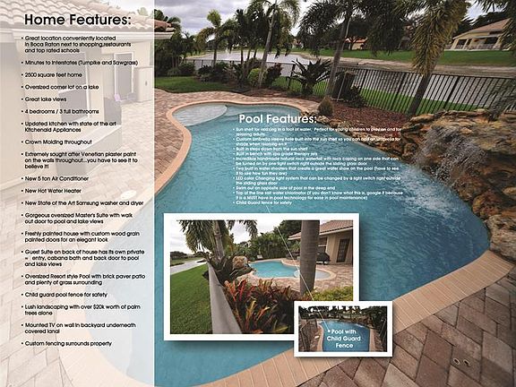 Fabulous one story house on oversized lakefront lot in exclusive guard-gated Lexington Estates. This gorgeous bright upgraded waterfront home with a spectacular pool with Rock waterfall a complete tropical oasis recently added $55K upgrade making this the most desirable house in Lexington Estates. Additional features and upgrades, new $25K kitchen, crown molding, exterior fence, 20K in landscaping, newer a/c with antimicrobial UV light and newer hot water heater. Exterior just painted and sealed. This homes features 3 spacious bedrooms with own bath plus a 4th bedroom used as an office, split floor plan. A must see - GREAT AMMENITIES FOR FAMILIES AND WEST BOCA SCHOOLS