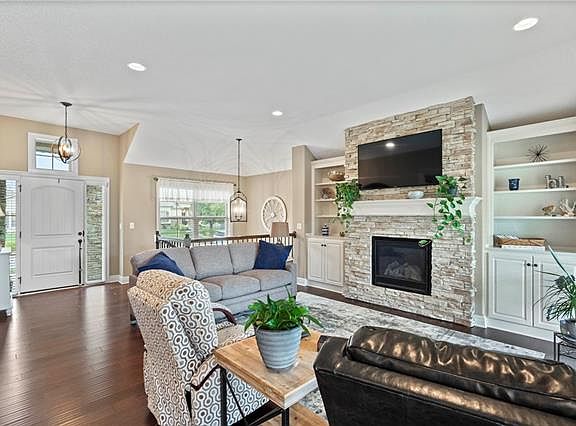 Exceptional quality you expect in an SAB Home in Raymore's favorite 55+ Maintenance provided community! This gorgeous home is certain to check all your boxes. You'll love all of the natural light. Open floor plan features hardwood floors, stacked stone fireplace with custom built-ins. Kitchen boasts granite countertops, stone back splash, spacious pantry and more. Large master suite with plenty of room for your furnitures and fabulous master bath that includes double vanity, granite countertops, tiled floor and shower. And, large walk-in closet! Third bedroom is in the finished basement along with 3rd full bath with shower, family room with wet bar and mini fridge. Abundant storage. The covered South facing patio is the perfect place to relax and entertain. Seller has absolutely loved this home and community. We think you will too! **Offer Deadline is Saturday, August 27th at noon**