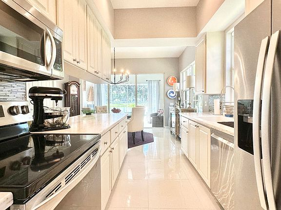 This home is truly unique! Water views from every window, spectacular sunsets! A former ''model'' home on a street with a variety of styles, very short distance to the wonderful RiverWalk Town center and close to the RiverWalk entry makes this property particularly desirable. Stunning 24 inch porcelain flooring everywhere except the principal bedroom (plush carpet) and laundry (ceramic tile).The home has 10 ft volume ceilings throughout. The Great room has a built in entertainment center with extra storage.The kitchen has been updated and has additional cabinetry, corian counters and high end appliances. The heated pool has recently been resurfaced and updated with new tile and converted to salt water. The bathrooms have also been renovated with new vanities & custom mirrors. The lot is oversized with lush landscaping. Accordion shutters, central vacuum, central alarm, wired for music throughout. One of a kind!!