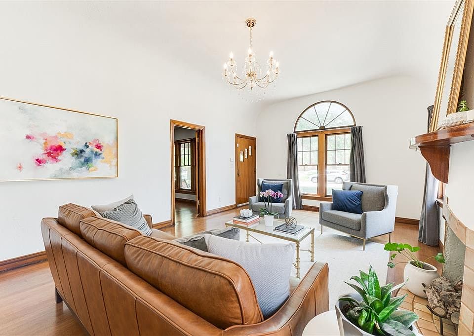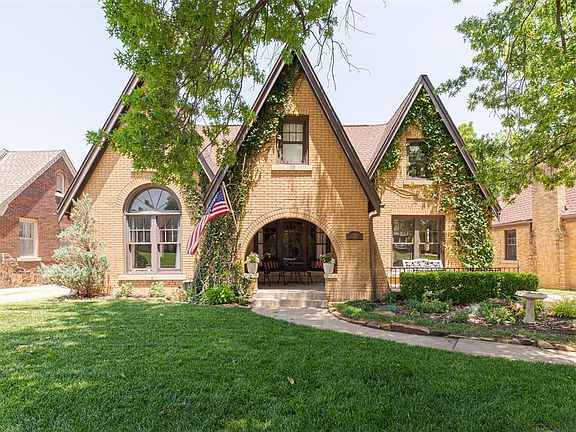 Nestled in the beloved Shepherd Historic District, this stunning Tudor revival home was built in 1934 and brims with charm, comfort and possibility. Thoughtfully updated to embrace modern conveniences, it maintains its original character. The graceful curves of the porch invite guests into your stunning formal living room, splendid with its crystal chandelier, coved ceilings and smooth, rounded fireplace. The formal dining room boasts its own chandelier and coved ceilings and leads into the gorgeously updated kitchen where you’ll find a breakfast nook, continuing hardwood floors, a dry bar with beverage fridge, white cabinetry and countertops and stainless steel appliances. A spacious second living area is just through the kitchen -- perfect for cozy movie nights. A hallway lined with darling built-in storage leads to the three bedrooms on the ground floor. There is a classic, original pink and black tiled hall bathroom and an ensuite black and white bath with shower off of the NE bedroom providing an option for a second primary suite. The second floor primary suite is expansive with gleaming hardwood floors, a walk-in closet and a fully tiled bathroom with spa tub, separate shower and vanity. The private backyard features a shady, paved entertaining space and an oversized garage with a self contained 2-bed, 1-bath apt ready to be finished out! This space could have amazing potential as a rental, an office suite, art studio or incredible guest quarters! Shepherd is a hidden gem with its own park, quiet streets that don't pass through, feeder for coveted Cleveland Elementary, and just blocks from many of OKC's most desirable spots to dine, shop, and play!