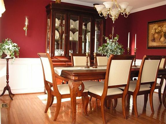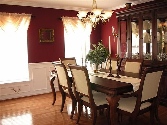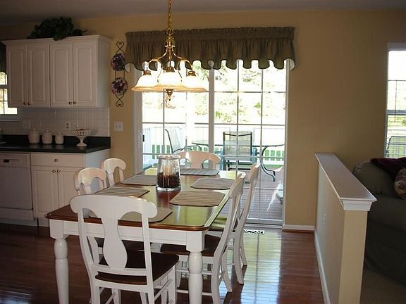 Beautiful landscaping and white pines surround this 4-bedroom, 2.5 bath Colonial Home located on a cul de sac in the Hunter Ridge Community. You'll love the polished hardwood floors that are durable and give a seamless look throughout the foyer, dining room, kitchen and breakfast area. The morning sun lights up the center island kitchen that is complimented by raised panel white cabinets trimmed with crown molding. Adjoining breakfast area is refreshingly open to the spacious family room with custom gas fireplace. Enjoy meals in the richly designed formal dining room that features wainscoting and crown molding. The basement was professionally finished with Berber carpet, built in cabinets and recessed lighting. The oversized low maintainence deck/railing enhances the pleasures of outdoor cookouts. Upgraded SEER 12 A/C.