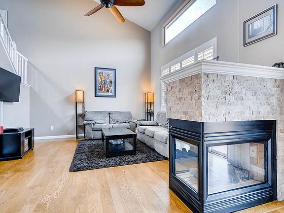 Spectacular home in The Bluffs! The main floor is boasting with gleaming hardwood floors. Kitchen with gas stove, stone back splash and great counter space. Dining area with 3-sided gas fireplace. Upgraded bathroom with granite counter tops and tile flooring. Plantation shutters throughout. Steps outside from Kitchen/Dinette onto the large deck. The front of the home has a southern exposure with a covered porch. Cherry Creek 5 school district. Hurry - won't last!