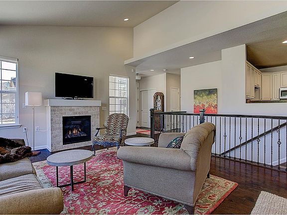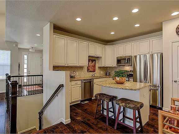 There's so much to appreciate in this designer inspired 3-bed, 3-bath ranch-style townhome. Situated on a greenbelt in the Saddle Rock neighborhood, natural light floods the open great room and dining room. You will also find vaulted ceilings and wide plank hardwood flooring throughout. The kitchen features slab granite countertops, stainless steel appliances, 42-inch upper cabinets and a pantry. Retreat to a large master suite with a 5-piece bath including jacuzzi tub, double sinks with gorgeous granite countertops and backsplash. Large walk-in closet. Invite guests down to finished basement with large media room, an additional full bath, and bedroom, perfect for office space or welcoming guests! Hunter Douglas blinds throughout. Buyer to verify all listing information which is considered reliable but not guaranteed.