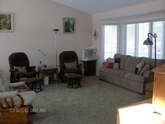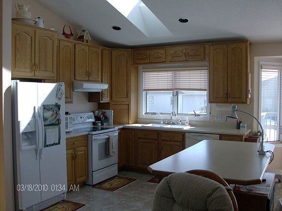 Sunny and bright open floor plan - Oak cabinetry w/ bar counter and skylight in kitchen - 2 egress windows - steel siding - patio door to deck off dining room