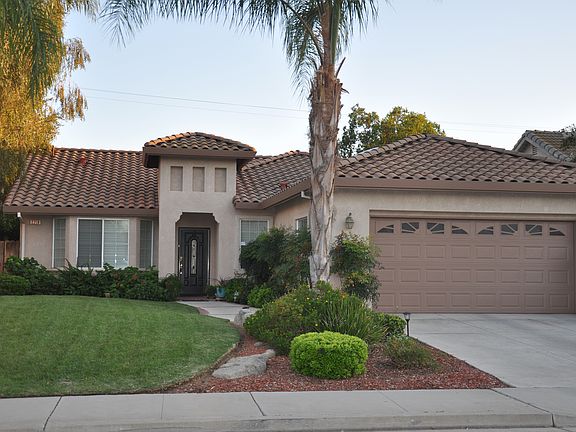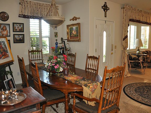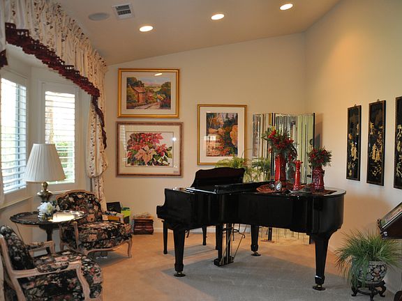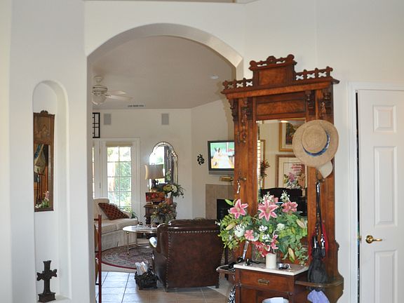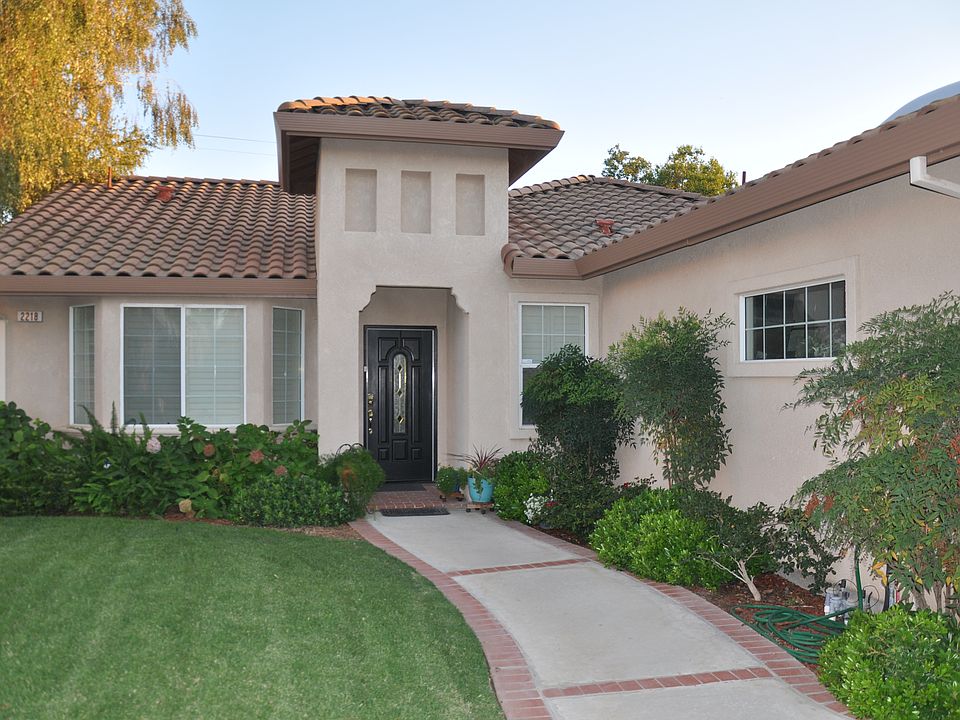 You will fall in love with this open floor plan that features vaulted ceilings throughout, with a formal living/music room and dining room. A garden window in kitchen, plus bay windows in living room and master bedroom. Three sky lights for natural light. The spacious family room includes an automatic gas log fireplace and a 36" screen TV mounted above the fireplace. Surround sound throughout home, back patio and garage. The garage is extra wide with built-in cabinets and a sky light. There is a freshly painted pergola in the back yard with two bomanite patios and English style water fountain. Dual sinks in the master bath with jacuzzi tub. Fans in all bedrooms and family room. Central heating throughout. Wired for alarm system. Tile and carpet are like new, along with ceramic tile counter tops. This is a super location.