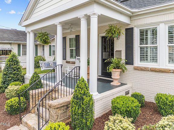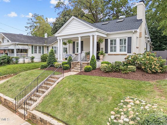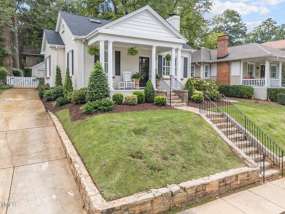 This beautifully reimagined Bloomsbury bungalow is more than a house, it's your gateway to a serene, sophisticated way of life. At the moment you step through the door, every detail invites you to slow down, unwind, and enjoy. This ultra charming brick home, accented with stone window pediments, is rock solid and located in the highly sought after and desirable Bloomsbury neighborhood, just steps from the vibrant energy of Raleigh's Hayes Barton & Five Points. Imagine short walks to Mandolin, Hayes Barton Cafe, barre3, NOFO Five Points Wine, Crafty & more. A slew of upgrades: new roof in 2022, HVAC 2022, new Rinnai tankless water heater in 2024 and the windows have been replaced throughout. The primary suite features a completely renovated bath with the warmth of heated floors and a sleek, walk-in shower with a frameless glass enclosure, setting the stage for a serene morning routine. The updated kitchen with a Wolf range & SS hood vent, quartz counters and new wine fridge is designed for gathering and features an open breakfast bar & custom seagrass blinds that are delightful. Swank Nina Campbell designer wall paper in the dining room, guest bedroom by Anna Weatherly and the primary is Scalamandre. New gas logs in the bespoke fireplace highlights the comfortable living room & plantation shutters added throughout. Thoughtful updates continue, outside, a private driveway leads to a detached garage and a fenced yard. The partially finished basement offers the extra space everyone needs. A neighborhood path connects you directly to the best coffee shops, dining, and local charm of Five Points, making it easy to live local and love every minute. This home isn't just a place to live, it's a lifestyle that blends character, comfort, and convenience in one of Raleigh's most beloved neighborhoods.