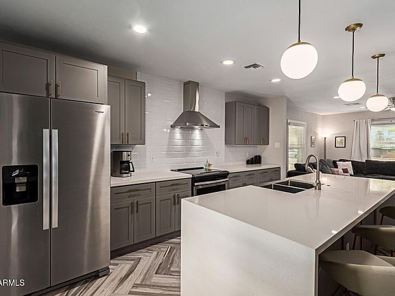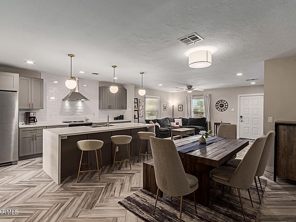 Nestled in the heart of the coveted Coronado Historic District, this beautifully remodeled 3-bedroom, 2-bathroom home seamlessly blends historic charm with contemporary elegance. The 2017 full remodel transformed this residence into a modern masterpiece while preserving its timeless character. Step inside to discover a bright, airy great room concept with a herringbone tile layout, offering effortless flow and versatility—perfect for both entertaining and everyday living. The stunning chef's kitchen boasts a large quartz island with a waterfall edge, a built-in microwave, and ample counter space for culinary creations. The oversized primary suite offers a spacious walk-in closet and a beautifully remodeled en-suite bath. Both bathrooms have been thoughtfully updated with stylish finishes. Designed for both beauty and comfort, this home features a brand-new AC unit (2024), new insulation, and new Pella windows and sliding door for enhanced energy efficiency. Additional upgrades include new front and back entry doors, fresh exterior paint, new backyard gates, and thoughtfully designed backyard landscaping with built-in benches. Enjoy the perfect downtown location, just minutes from world-class hospitals, museums, top-rated restaurants, and entertainment. With easy access to freeways, Chase Field, and Sky Harbor Airport, this home offers the best of Phoenix living.