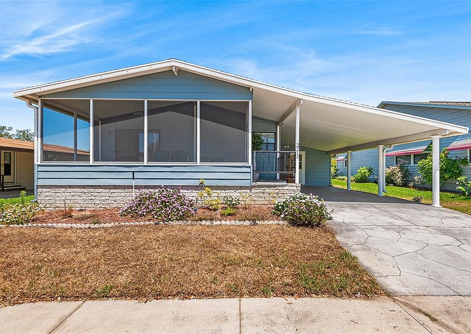 This charming home features two bedrooms and two full bathrooms, making it the perfect size for a couple who love to entertain guests. Upon entering the home, you are greeted by an open concept living and dining area. The living room is bright and airy with large windows that let in plenty of natural light. The dining area features a cute storage area, perfect for storing and showcasing your treasured items. The kitchen is located adjacent to the dining area and is fully equipped with all appliances. The countertops provide ample workspace for cooking and baking. The two bedrooms are located down the hall, providing privacy and separation. The master bedroom has an en-suite bathroom with a walk-in shower and vanity. The guest bedroom is situated near the second full bathroom, which features a shower tub combo and plenty of storage. Outside, the home has a large, screened patio area perfect for enjoying a morning coffee or watching the sunset. The platform lift is conveniently installed under cover of the carport and provides a sturdy platform for a wheelchair user to ride up and down. The storage area with washer, dryer and soaking sink provides an efficient and organized solution for managing laundry needs while also providing additional storage space for other household items The landscaping is low-maintenance and features beautiful plants that require little upkeep. This cute 2-bedroom 2-bathroom home in a 55+ golf community is an ideal option for seniors looking to downsize and simplify their lives while still enjoying the benefits of an active community and modern amenities. Schedule a tour today to see this great home.