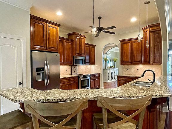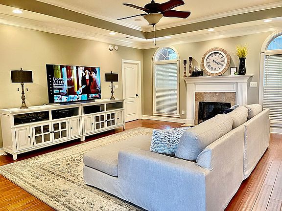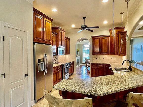 Custom built home on 1 acre lot located in the city limits. Open floor plan with 10 ft. ceilings on the main floor. Family room with fireplace. Open dining area and beautiful crown molding throughout. Home is equipped with surround sound in family room, master bath and back porch. Master suite includes double trey ceilings, two large walk-in closets, and tiled shower. 2nd and 3rd bedrooms have Jack and Jill bath. Downstairs has additional room with closet that could be used as a bedroom or as an office. Kitchen with breakfast nook includes tile floors with tile back splash, granite counter tops and stainless appliances. Upstairs has a large bedroom or bonus room and full bath with tile floor. Back yard is fenced in with a covered porch and patio featuring an outdoor fireplace. Professional landscaping with sprinkler system.
