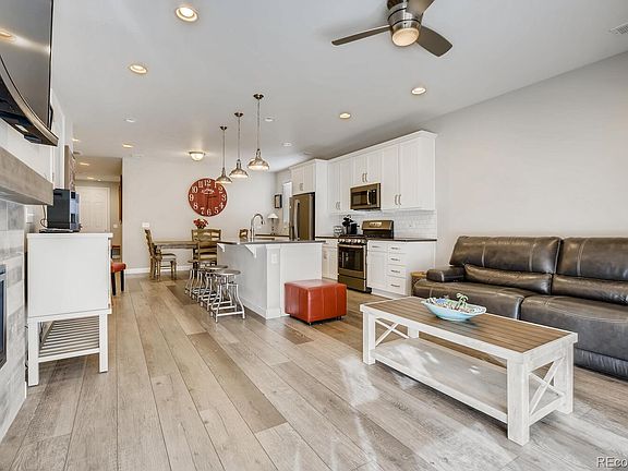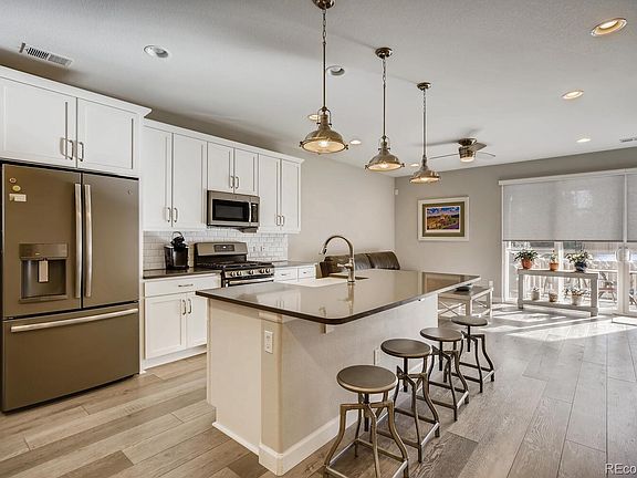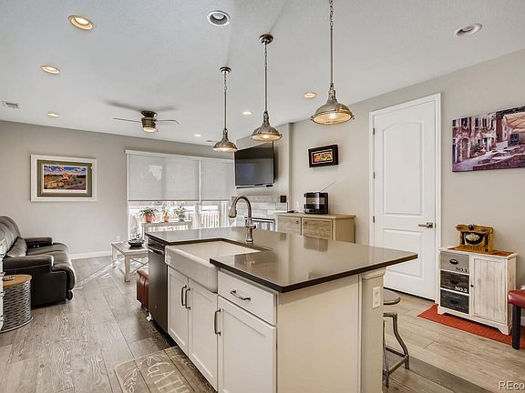 This Beautiful and Charming new build was completed in 2018 and offers all high end finishes any owner is looking for. Large open kitchen with big island, quartz counters, high end black stainless appliances with gas stove, soft-close cabinetry, farm sink, built-in garbage cans shelf, modern lighting, pantry, dinning area space. Bright and cozy living room with modern style fireplace and custom privacy shades, office room space conveniently hidden on the far right corner of the living room offers bright light and view to enjoy. Master bedroom suite features vaulted ceiling, big walk-in closet and masters bath. Additional two bedrooms are spacious and share a second updated full bathroom. Flooring is covered with luxury vinyl and top quality carpeting and tiles. Enjoy the abundance of natural light from the oversized glass sliders to your private, low maintenance and fully fenced back yard that features covered wrap around patio, additional upgrades like natural gas line for a grill, patio ceiling fan and custom shades for the west sun exposure. Easy access to E-470 and close to shopping and restaurants. HURRY! This one won't last long!
