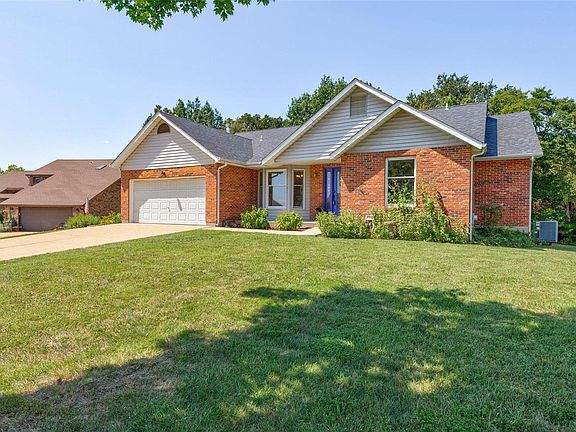 This stately ranch style home is situated in a quiet cul-de-sac in the heart of Festus. It has 4 bedrooms and 3 baths. Featuring hardwood flooring in the separate dining room and great room. This great room also offers wood burning fireplace, vaulted ceilings and skylights. Gourmet kitchen hosts granite countertops, pantry and stainless steel appliances. Just off of the breakfast room is a large deck overlooking the park like setting yard, that backs to trees. Main floor laundry. Contains custom window shades in main living areas. Whether enjoying your morning coffee with the private access to the deck or soaking in the tub included in the spa-like bath, the primary suite is designed with relaxation in mind, . Tons of additional living space is offered in the walk-out lower level, hosting an office, family room with freestanding wood burning stove and bathroom. If you love organization, you will love all of the built-in shelving in the unfinished area. This home checks all the boxes!