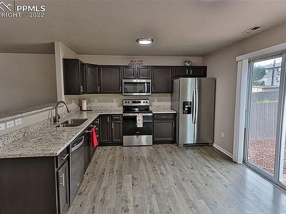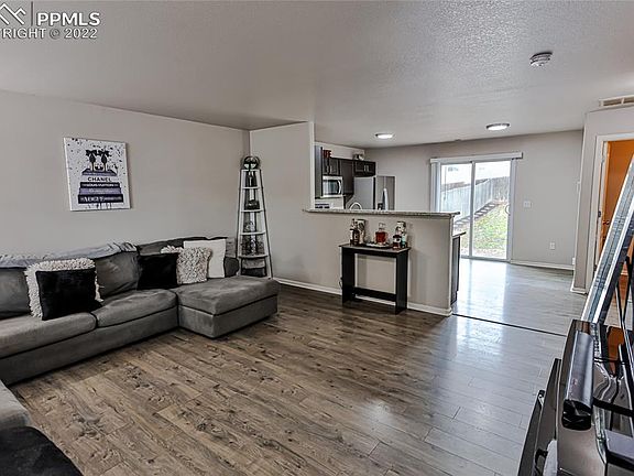 Back on market! Homes gets a NEW roof. Move in ready! This can by your home by the Holidays! Spacious sized living room with an open concept floor plan, great for entertaining. Designer LV wood laminate flooring and beautiful granite counter tops. Newer Stainless steel appliances and updated cabinetry plenty of counter top space. A sliding glass door from kitchen leads to a gigantic backyard completely fenced and private. Large bedrooms with ceiling fans and good size closets. The master bedroom, complete with a full bathroom and walk in closet. Laundry room upstairs. Great location, close to schools shopping and parks. Ideal commute to Fort Carson, Peterson and Air Force Bases. Air conditioning! 3 bed 3 bath plus a 2 car garage.... Make this your home today!