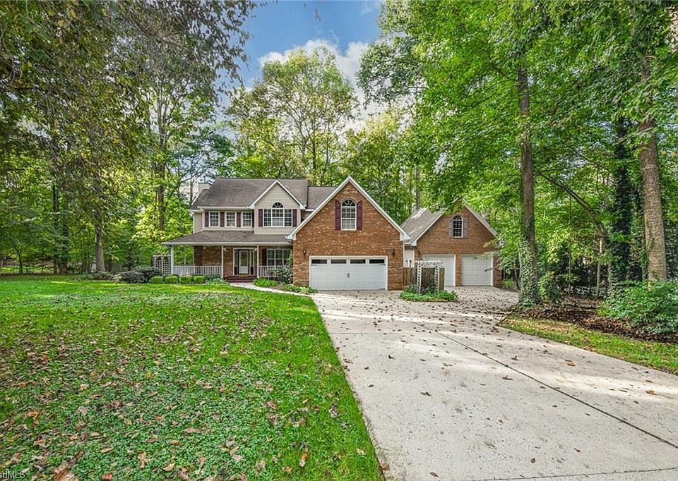 Want PRIVACY? Check video for a walkthrough. This Serenity Pointe Neighborhood (homes rarely available) home has gleaming hardwood floors throughout the main area, stunning built in cabinets framing the cozy fireplace in great room, elegant Marsh cabinetry in the kitchen, luxurious main level primary suite with a spa-like bath features skylights above separate separate soaking tub. The sunroom w/serene views of the wooded, completely private backyard and a huge deck (41x21) for all your gatherings. The home has a large attached garage and a detached garage (36x22) with upper level floored storage & the main level has room for your boat, work truck, small camper & includes a wired workshop area in the back. This home is a rare find—offering space, privacy, and thoughtful upgrades throughout. Conveniently near Hwy 74 puts you minutes from HP, WS & GSO. Whether you're a hobbyist, nature lover, or just seeking a peaceful place to call home, this property checks all the boxes.