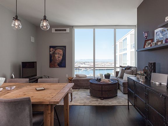 Resort like views from this elegant one-bedroom, one-bath luxury condominium. From floor-to-ceiling glass, the southern sparkling water and sailboat views are tranquilizing. Watch the planes take off from Oakland and San Francisco or view the bay all the way to the San Mateo Bridge. Designer upgrades enhance the open floor plan. Beautiful lighting and rich hardwood floors throughout are lovely additions. The bathroom is luxurious and roomy. Double sinks and a separate shower stall give way to a large soaking tub and granite and tile surfaces. The kitchen is inviting with granite counters and stainless Bosch appliances. Nest thermostat and automated window shades are all part of the package. Additional parking space can be added at $25,000.