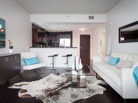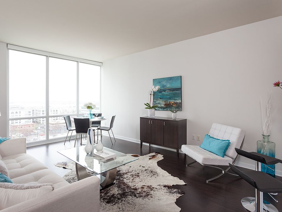 Sleek and stylish two-bedroom, two and a half bath condominium in Jack London’s premier luxury high-rise, The Ellington. Open and interactive, the kitchen and living areas are dominated by lovely views of sailboats, Alameda, the San Francisco Bay, and coastal mountains. The kitchen has Bosch stainless appliances, granite counters, track, recessed and under-counter lighting, as well as gas cooking. Beyond the view is functionality. Both bedrooms are privately accessed from an elegant hallway. They each have multiple closets, one of which has a private deck. The design is clean and modern with dark, rich hardwood floors and new low profile carpeting. The master bath is roomy and practical with a large soaking bathtub, separate shower stall, dual sinks, and granite counters. Washer, dryer, air-conditioning, two-car parking, and an extra-large storage locker included.