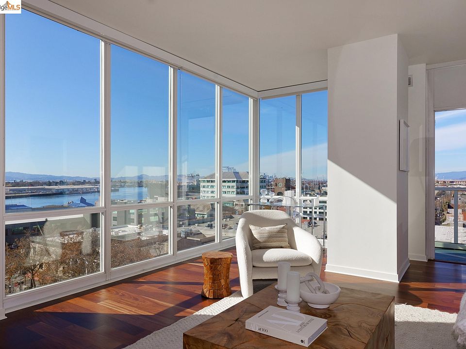 Luxurious 9th Floor Corner Condo at The Ellington -- Oakland's Premier Jack London Residence. Enjoy a panoramic view of the Oakland Waterfront, Jack London Square, SF, Mt. Tamalpais and 3 Bridges! (Bay Bridge, Golden Gate, Richmond Bridge). This expansive 945+/- square foot corner unit features dramatic floor-to-ceiling windows that run the length of the living room and bedroom. A corner glass nook makes the perfect home office! Designer kitchen: granite countertops, stainless steel appliances, granite bistro bar. Exotic hardwood floors. Balcony. Plush carpeted bedroom w/custom closets. Ensuite bathroom features Kohler deep soaking bathtub, a separate glass shower enclosure, and dual sinks. Guest 1/2 bath off the living room. Custom window blinds throughout. Individually controlled A/C & heat. Broadband and cable ready. One deeded parking space + onsite storage locker. Enjoy great dining & entertainment in Jack London Square, downtown & Uptown Districts. Ideal Commuter location! BART, Ferry & Amtrak are nearby. Walkscore of 96!