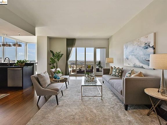 Luxury 9th Floor 2bd/2ba Condo w/Stunning Waterfront Views at The Ellington, Oakland's Premiere Jack London Residence. Fantastic floor plan & panoramic views on 3 sides (South, East & North) make this property one of The Ellington's most coveted units. Living room opens to large balcony that overlooks the Estuary. Picturesque views of the Waterfront, East Bay Hills, & Downtown Oakland's iconic Tribune Tower. Dramatic floor-to-ceiling windows. Glass dining nook. Designer kitchen w/stainless Bosch appliances. Sexy hardwood floors. Two luxurious bathrooms, both with Kohler soaking tub & separate frameless glass shower enclosure. Custom closet systems. Air conditioning. Amenities include: concierge, pool & spa, fitness center, designer clubroom. Two parking+large deeded storage locker. Ideal commuter location; BART, the Ferry, Amtrak, and easy highway access are all within reach. Oakland's free B-line Broadway Shuttle stops right outside the lobby door. Walk Score of 92! Sat & Sun 1-4