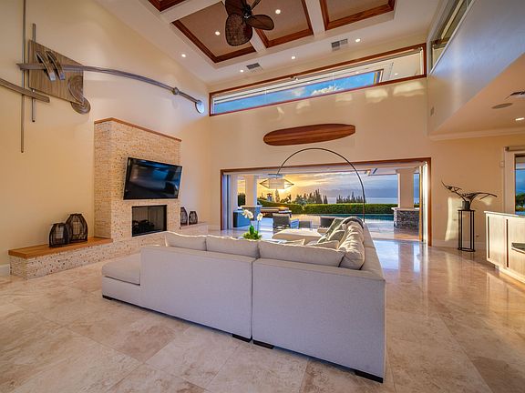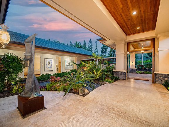 From the moment you enter this home, across a bridge through a tropically landscaped courtyard, the views of the Pacific Ocean and the outer island of Molokai begin to unfold. The great room features soaring ceilings and a seamless indoor/outdoor flow with pocketing doors that open to the expansive lanai and infinity edge pool with a beach shelf and spa. The inner courtyard provides a serene setting, with floor to ceiling windows that will illuminate your art collection and showcases the gardens from the guest bedroom suites and the living room and filling the home with natural light. The main floor features three bedroom suites, as well as the living room, kitchen, dining room, pantry and laundry room. The kitchen is a chef’s dream, featuring appliances by Sub Zero, Bosch, and Wolf, including a Sub Zero wine storage cabinet and refrigerator drawers, as well as a proofing drawer for baking. The kitchen opens to outdoor dining with a built-in bar. The gracious Primary Bedroom Suite is on the ground floor, with a sitting area and fireplace. The en suite features a jacuzzi tub, walk in shower, and beautifully landscaped outdoor shower garden. Upstairs is an office/flex space, second Primary Bedroom suite complete with its own laundry and a private lanai with panoramic ocean and outer island views. The oversized garage has room for two cars, a golf cart, and features additional storage. The sculpture in the garden and living room by Robert Hague are included.