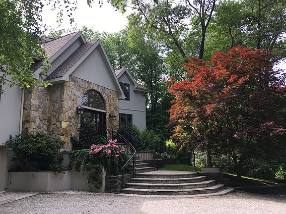 Attractive light-filled Contemporary home. Grand entry, open floor plan, multiple skylights, high ceilings, large rooms and oversized windows are featured in this well constructed home. Formal living room with fireplace and double glass doors to patio. Office and full bath. Formal dining room. Spacious eat-in kitchen open to family room has a wonderful flow for entertaining. Kitchen includes custom cabinets, task lighting, granite counters, island with 6-burner cooktop, pastry counter, SubZero fridge, Wolf oven and microwave, desk and door to patio. Laundry and back stairs off kitchen. Family room with soaring ceiling, stone fireplace, Palladian windows, skylights and double glass doors to flagstone patio. Upper level master bedroom en-suite with fireplace, vaulted ceiling and balcony. Three roomy bedrooms and full bath, all with vaulted ceilings. Lower level walkout recreation/exercise room. Oversized 2 car garage. Private level landscaped property. Minutes to train, town and parkway.