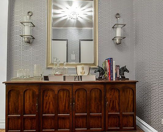 Classic subway tileModern designGenerous closetsWallpapered foyerNewly updated bathroomWindowed kitchen