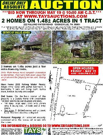 ONLINE ONLY ABSOLUTE AUCTION2 Homes in Need of Complete Restoration on 1.48+/- acres Just Minutes from the City Limits!!222 Falling Water Rd - Cookeville, TN 38501For info & for BIDDING, please visit www.taysauctions.comBidding from April 21,2015 through May 19,2015 at 10am CDTMain Home: Single story w/ partial basement, 3 bd / 1 ba, living room, kitchen, laundry, bonus room & carport.2nd Home: 1st story - cinderblock w/ large open room, kitchen including eating bar, full bath & 2 entry doors.2nd story - frame construction w/ 3 divided rooms & a closet.Open Houses: Friday - May 15th - 4pm to 6pm CDTEstate of Vallie JonesEstate Attorney: Joy Buck Gothard 931.526.4045Terms: 10% Buyer's Premium. 20% down at end of auction. Balance due at closing by or about June 19. See full terms on website.Tays Realty & Auction LLC - Firm # 2056620 Maxwell StCookeville, TN 38501(931) 526-2307www.taysauctions.com