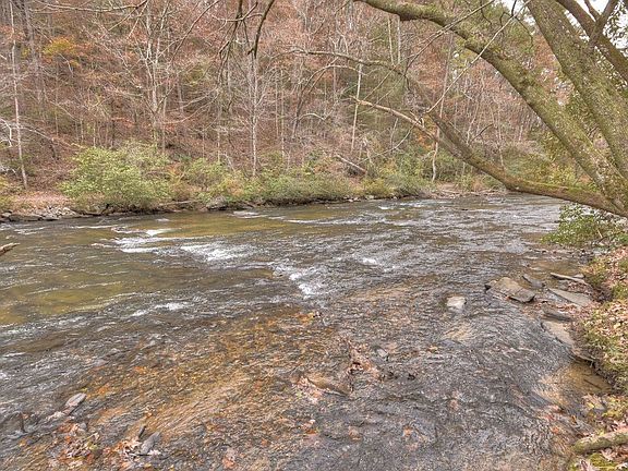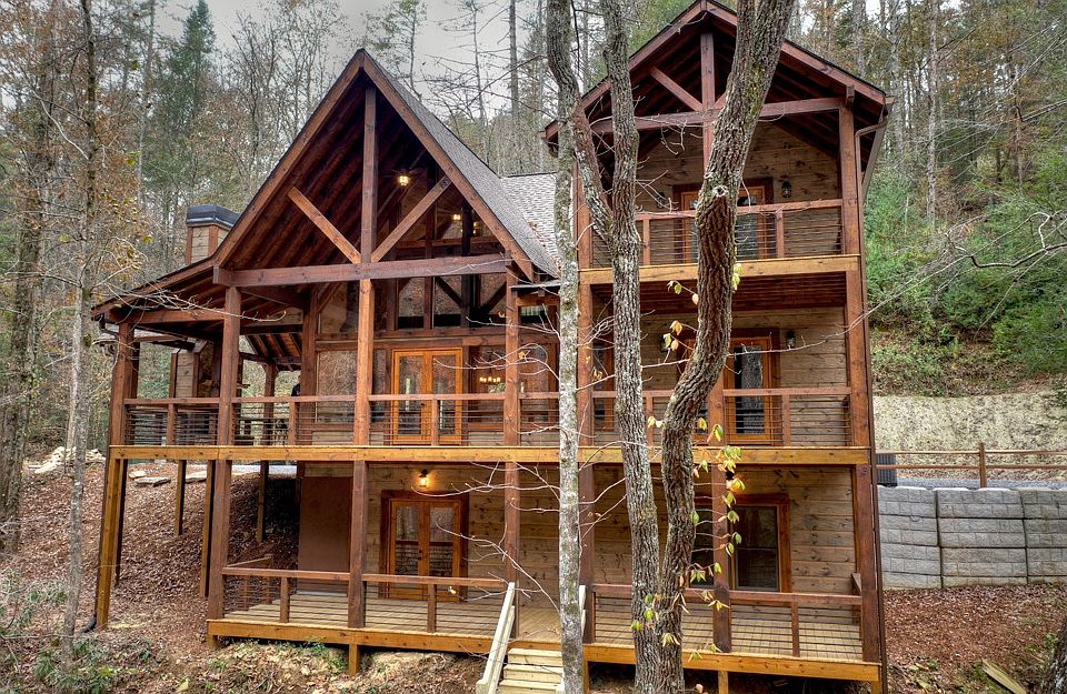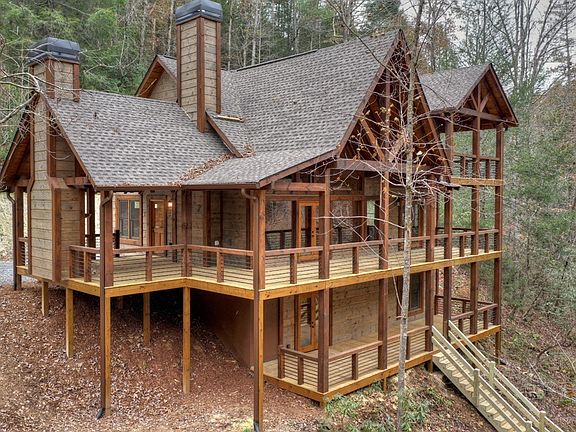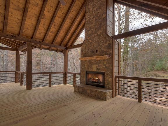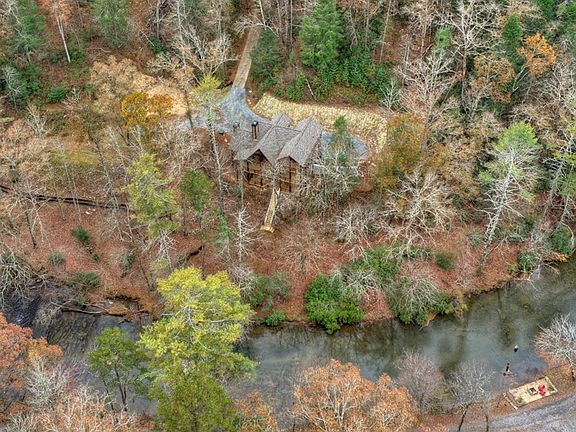 Brand NEW Lodge Style Rustic Retreat overlooking the rushing rapids of MOUNTAINTOWN CREEK! This 4BR/3.5BA home is located in Fish Tale Cove, a PRIVATE gated community, less than 10 min. from Downtown Ellijay. Love to FISH? Prepare to be WOWED w/over 200 ft of frontage on Designated Class A Trout Stream! You will love the massive post & beam covered porches and party porch w/outdoor fireplace. Handcrafted finishes throughout; Open great room w/soaring cathedral ceiling & stone fireplace is perfect for family gatherings; beautiful 2 story wall of windows; well appointed kitchen, half bath & dining area. Master & laundry conveniently located on main. Huge LOFT plus 2 bedrooms, private balcony & bath on upper level. Full FINISHED terrace level w/huge family room, guest BR/BA & storage for all your river gear. No zipline needed here, EASY steps to the water. See V-Tour