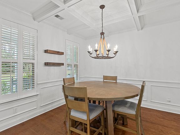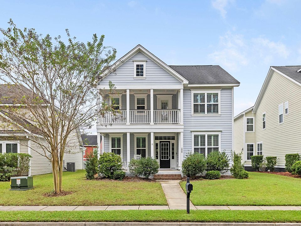 This stunning residence will captivate you the moment you arrive, with its classic Charleston-style double front porches and timeless curb appeal. Featuring durable Hardie Plank siding and custom plantation shutters throughout, this home perfectly blends elegance with southern charm. Step inside to find a beautifully appointed formal dining room with wainscoting and a coffered ceiling to your left, and a spacious, light-filled office to your right. The first floor showcases gleaming hardwood floors, crown molding, and an open-concept living area that's perfect for entertaining. The chef's kitchen is a true highlight, complete with granite countertops, espresso cabinetry with crown molding, stainless steel appliances, a gas range, and bar-top seating.Enjoy casual dining in the cozy breakfast area, which offers easy access to the attached two-car garage. Upstairs, the expansive owner's suite is a peaceful retreat featuring a private porch, ideal for enjoying your morning coffee. The luxurious en suite bathroom includes dual vanities, a large garden tub, a separate shower, and a spacious walk-in closet. You'll also find two additional bedrooms, a full guest bath, and a versatile bonus room that can serve as a fourth bedroom or flex space. Additional features include 9-foot ceilings on both levels and updated HVAC for year-round comfort. The backyard oasis offers a large screened-in porch and a fire pit area perfect for relaxing or entertaining on cool evenings. Located in the highly desirable Foxbank community, you'll enjoy access to resort-style amenities including pools, a fitness center (included with your HOA), playground, dog park, walking trails, and a 67-acre lake with a pavilion and fishing dock. Conveniently situated just 30 miles from Charleston, 35 miles from local beaches, and minutes from shopping, dining, and boat landings this home truly offers the best of Lowcountry living.