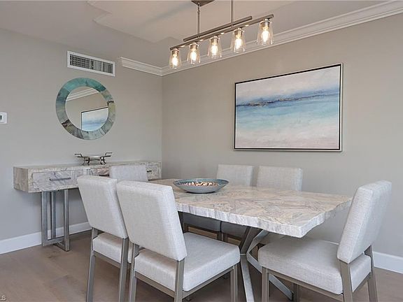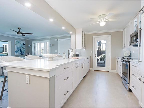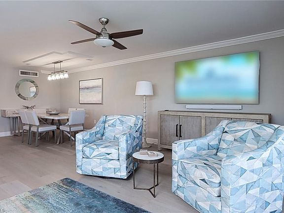 AVAILABLE FOR 2026 Season!! Owner has reduced the price by $ 2,000/mo. for the 2026 Season! BOAT DOCK available to lease! Owner is flexible on dates 90-day min. COMPLETELY REMODELED!! Beautiful panoramic views of the Moorings Bay! This completely remodeled and upgraded 3 bedroom/3 bath condo has stunning water views from every room! As you enter the front door, you immediately feel as though you are on a cruise ship, surrounded by serene Bay Waters, and one may rent a boat dock for your boat, giving easy access to the Gulf of America! The coastal, contemporary look offers an open floor plan, using soft blues and whites in design. The living room has a white leather couch, two blue and white upholstered chairs, entertainment, center and large TV. The dining area has a rectangular stone top table, seating for six, and buffet. The kitchen offers all white cabinetry, stainless appliances, and quartz counters/ bar area with four stools. The primary suite offers a king size bed, set in a neutral toned, upholstered bedframe, dresser, TV, closet, and private bath, with a spacious walk-in shower, and dual vanities. The two guest bedrooms offer a king size bed, dresser, TV, and private bath with a walk-in shower. Amenities at the Commodore Club complex include a community pool, gas grill, Chikee Hut entertaining area with an outdoor kitchen and bar, and covered carport for parking. The Moorings is a quiet community, walking distance to Naples' pristine, sandy beach. You are an easy bike, ride to "Venetian Village" shops, restaurants, and galleries, as well as an easy drive to 5th Avenue and Third Street to enjoy their shops, restaurants, and galleries.