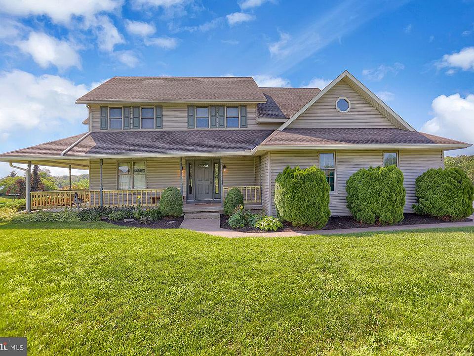 What more could you want?? This gorgeous traditional home sits amidst a 2.05-acre lot with stunning views of the countryside. A wrap-around porch welcomes you to sit and relax and enjoy the peaceful setting. The wood-floor entry leads to a large hall closet and powder room. An eat-in kitchen with ceramic tile floors offers oak cabinets, newer appliances, an island with more storage space and a desk area for homework or paying the bills. You'll enjoy watching movies in the sunken family room with a wood-burning fireplace and custom blinds. How about hosting Friendsgiving in your formal dining room! Can you picture a piano in the formal living room? Upstairs you'll find a large owner's suite with a jetted tub, double-bowl vanities and a walk-in closet. A hall bath, laundry room with utility sink (perfect for washing the pups), and 3 more bedrooms including one with a bonus area which would make a fabulous play room. The walkout basement has a full bath (no sink), pellet stove for efficient supplemental heat, new steel insulated doors and updated water filter system. We saved the best for last! Got toys?! This detached 29'x30' pole garage is heated with propane, insulated and has electric and includes the air compressor. There's also a 14 x18 shed, a basketball court with newer 5" thick concrete, new well with new casing and wiring, and 50 year shingles installed 6 years ago! Porch railing, front door to be painted prior to closing and deck will be re-stained. Sale to be contingent upon seller finding suitable housing/ would prefer a quick settlement with lease-back.
