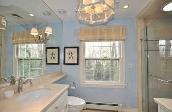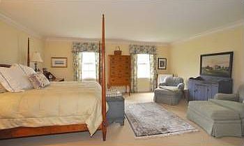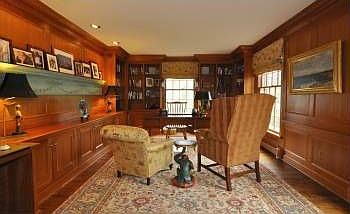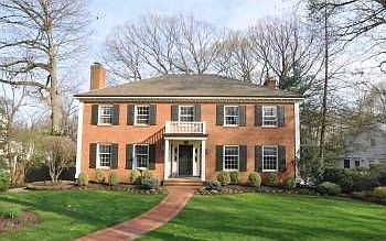 A classic symmetrical facade with a pillared portico at its center gives this handsome brick-front center hall Colonial its impressive curb appeal.