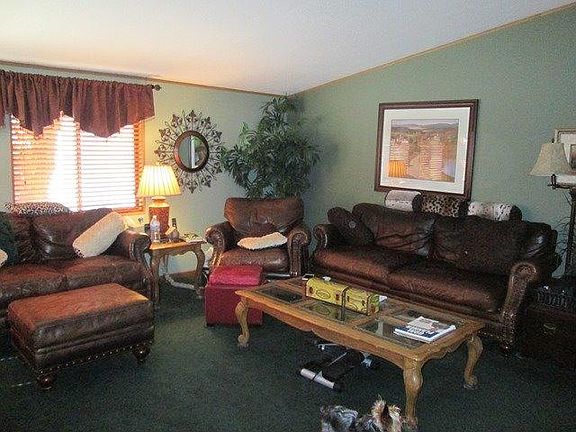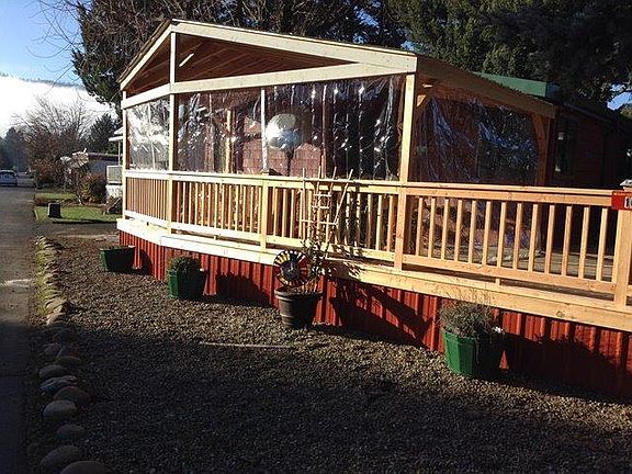 You have to see this beautiful home to fully appreciate it. Extensive upgrades inside and out made in 2013. Some of these items include wood laminate floor, new carpet, counters, appliances, heat pump, siding, drive way and new roof! Offering 3 bedrooms, 2 baths, sizable living room, efficient kitchen with large dining area and double paned windows throughout make it a light and bright home. There is a large wrap around deck that is partially covered with ceiling fan, providing plenty of room for entertaining and offers wonderful views of the mountains. Very large lot with chain link fence enclosing back and side yards. Outside storage shed included. This is a quiet and well maintained 55+ senior park. All located close to schools, town and city services. Don't miss out on this opportunity.