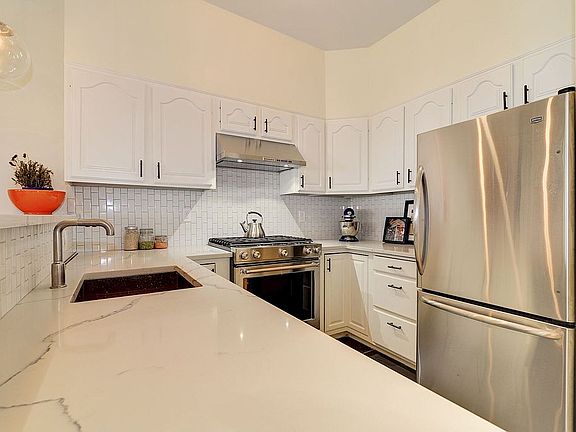 Appreciate peace & quiet on the less traveled Park Ave inside this modern well appointed, bright and spacious residence. The home features two bedrooms, two baths, and highly desirable private terrace perfect for relaxing on a sunny day. The interiors features large living room with wood burning decorative fireplace, dedicated dining area, dramatic 12 foot pitched ceilings, and three large-sized windows. Enjoy the recently updated kitchen with Quartz counters & KitchenAid stainless steel appliances, and plenty of cabinetry. Primary bedroom suite boasts a fully renovated marble bath with Kohler fixtures and gorgeous deep soaking tub. Large second bedroom with great closet space. Renovated second marble bath with spa shower. Discover an abundance of closet systems and bonus storage space off of mechanical closet. In addition the residence has central air conditioning & heating system, in-unit washer & dryer, and low HOA fee of $335 per month. The possibility to convert dining area into a third room if one wishes. Conveniently located to all modes of transportation including PATH and busses , shopping, restaurants, Church Square Park and much more.