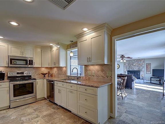Wonderful move in ready one level Ranch on quiet street. Large open family room with gas insert fireplace and slider to deck. Sunny updated kitchen, granite counters , stainless steel appliances , soft close cabinets and drawers. Three bedroom ,one Full remodeled bath .Hardwood floors through bedrooms and living room . Bright fireplaced living room with second gas insert. All fresh neutral paint colors through out the home. Large unfinished basement with hatchway.Replacement windows, newer roof,newer furnace and hot water heater . Gas and Central Air. Nothing to do but move in ! Beautifully landscaped front yard with paver walkway, lovely slate and brick front step entry.