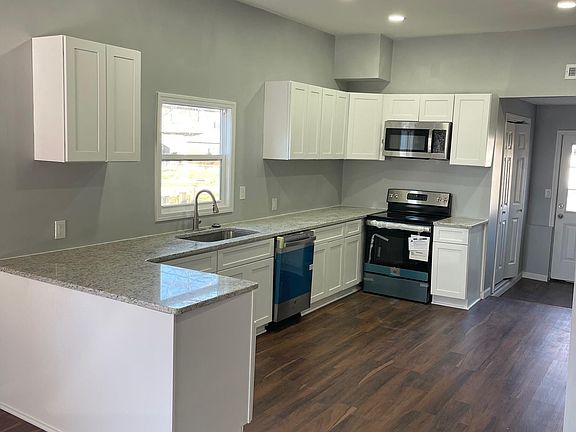 This remodeled home features wood look laminate flooring, granite countertops,New Appliances, recessed lighting, open concept, dining area, laundry room with easy access. 3 bedrooms, 2 full baths, plenty of storage, covered front porch and large backyard.