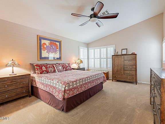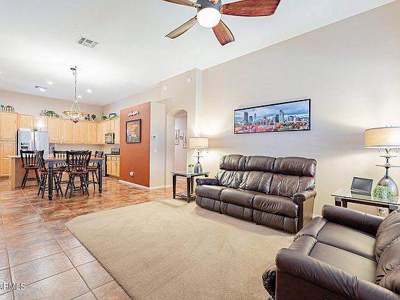 Located in the Golf Course community of Coldwater Springs, this residence features a popular floorplan with 4 full bedrooms and 2 baths, plus a 3 car garage, private pool and an RV gate! Pride of ownership is evident throughout. Vaulted ceilings, shutters, and entertainment niche. Top of the line stainless steel kitchen appliances. Private door from Primary to covered patio, bath has double sinks, separate tub & shower, and a spacious walk-in closet. Sparkling pool for those Arizona days. Nice covered front porch sitting area to enjoy cool evenings. Great golf course community with shaded private park, playground & basketball court.