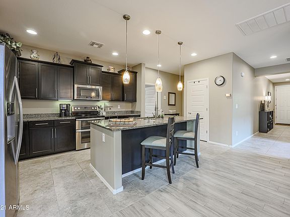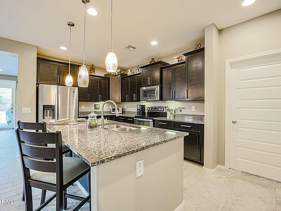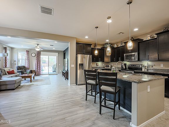 BACK ON MARKET fully loaded, Custom Acacia model with double-door Den, extended Master suite and nearly every upgraded option available (over $25k in builder upgrades)!! Kitchen features huge island, granite countertops, double-oven, pull-out cabinets and a huge walk-in pantry. Hobby room features plumbing for optional utility sink and an additional large storage closet/pantry. Extended garage has overhead storage with epoxy flooring and insulated door. Backyard features an extended patio with Pergola! Huge extended master suite with walk-in shower, double sinks and walk-in closet. OWNED SOLAR! Seller currently has no APS bill with credits back at end of year! CFD is paid in Full!!