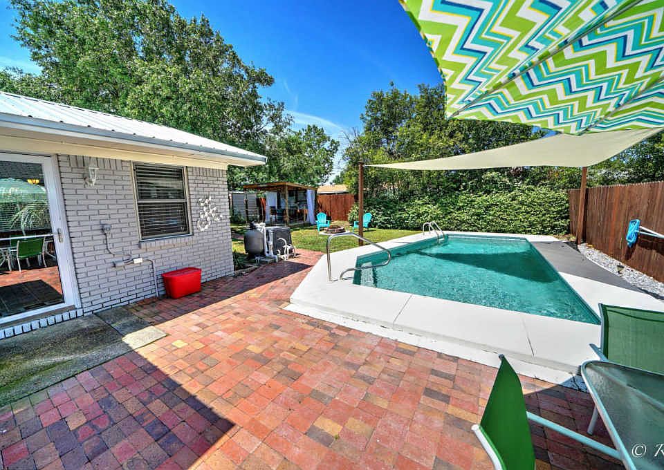 - Exterior: Fenced Chain Link, Porch Covered, Yard Building, Fenced Back Yard, Pool, Patio Open, Workshop